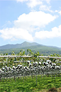 市川果樹園は、中野市のシンボル「高社山」のふもとにあり、遠く長野市まで見渡せる日当たりの良い斜面には、りんごやぶどうなどの木々が広がっています。